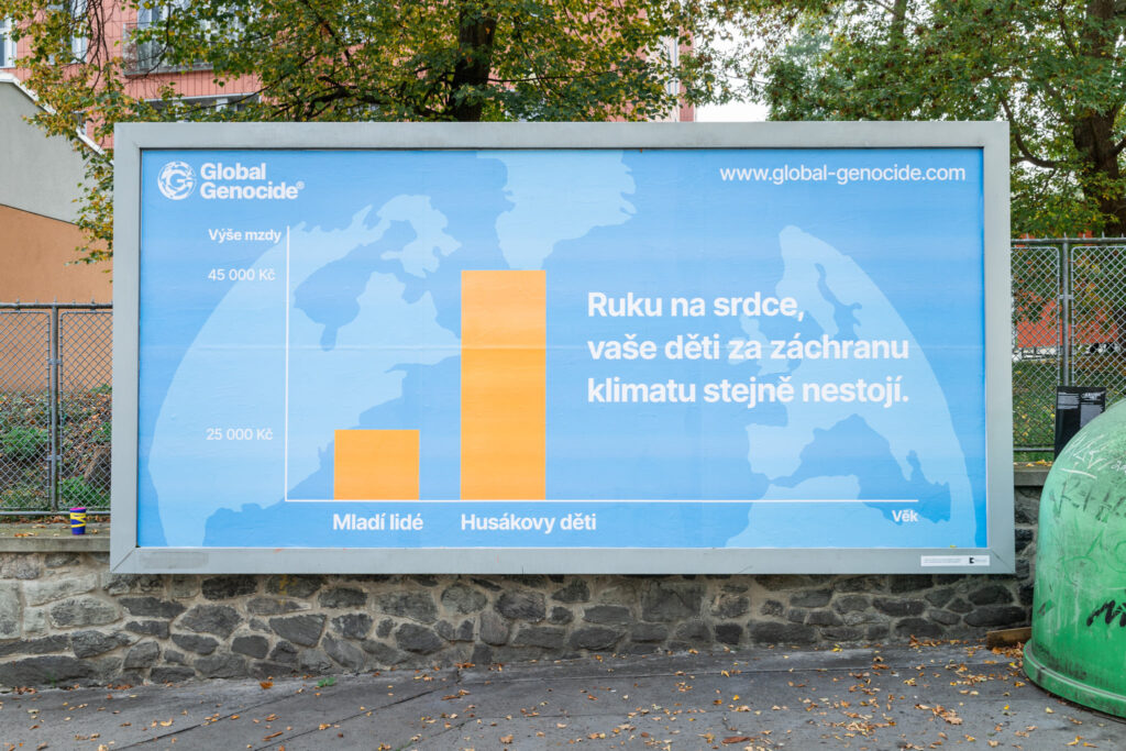 Dzięki naszemu silnemu programowi i profesjonalizmowi naszego działu marketingu udało nam się zdobyć dwa miejsca na billboardy w Uściu nad Łabą, nawet na ogrodzeniu przed uniwersytetem. Cieszyliśmy się, że rośnie zainteresowanie naszym produktem – Globalna zmiana klimatu™ – i nie chcieliśmy zawieść uniwersytetu. Przygotowaliśmy dwa oryginalne billboardy wskazujące na nieudolność i wynikającą z niej nędzę nadchodzącego pokolenia – przeciwstawiając je generacji tzw. dzieci husakowskich, urodzonych w czasie wyżu demograficznego lat 70. Postanowiliśmy odnieść się do absurdalności wysiłków mających na celu zachowanie jakichkolwiek zasobów naturalnych, bogactwa czy stabilności ekosystemu dla tego nadchodzącego pokolenia, nawet kosztem chwilowego zysku. Ci ludzie po prostu nie są tego warci, bo nie starają się wystarczająco mocno.