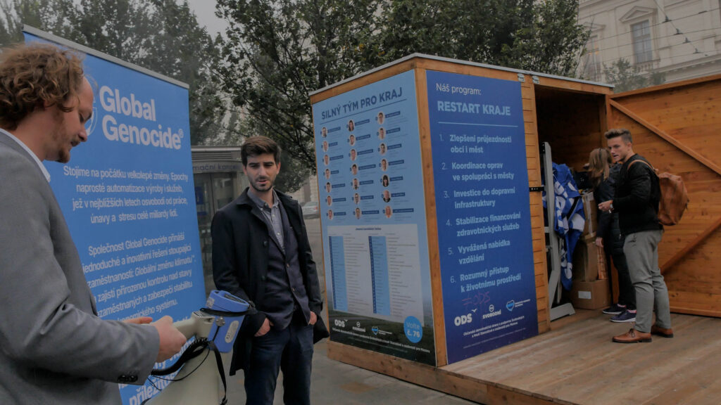 Aby wesprzeć Obywatelską Partię Demokratyczną (ODS), feniksa konserwatywnej polityki, Global Genocide zajęło stanowisko wyborcze przy ulicy Czeskiej w Brnie. Pierwotne oskarżenie o pasożytnictwo przerodziło się w udaną debatę z kandydującym liderem dr. n. med. Romanem Krausem. Debata dotyczyła głównie konieczności obalenia zamiarów fanatycznych ekologów i stopniowego zakończenia projektu globalnego klimatycznego ludobójstwa ubogich. W trakcie owocnej rozmowy doszło do wzajemnego porozumienia, które pozwoliło zapomnieć o początkowych niesnaskach. Rozgrzani gorącą herbatą i wizją jasnego jutra elit finansowych spędziliśmy razem miłe jesienne popołudnie.