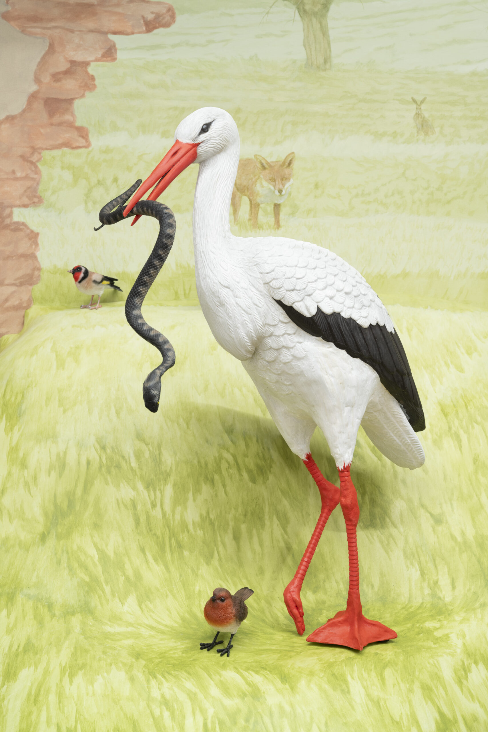 Praca Alicji Pakosz, „Ptaki mówią po polsku”, 2025, diorama, zrealizowana przy wsparciu Centrum Rzeźby Polskiej w Orońsku w ramach programu Rezydencji Artystycznych i Badawczych „Rzeźba w procesie”.
